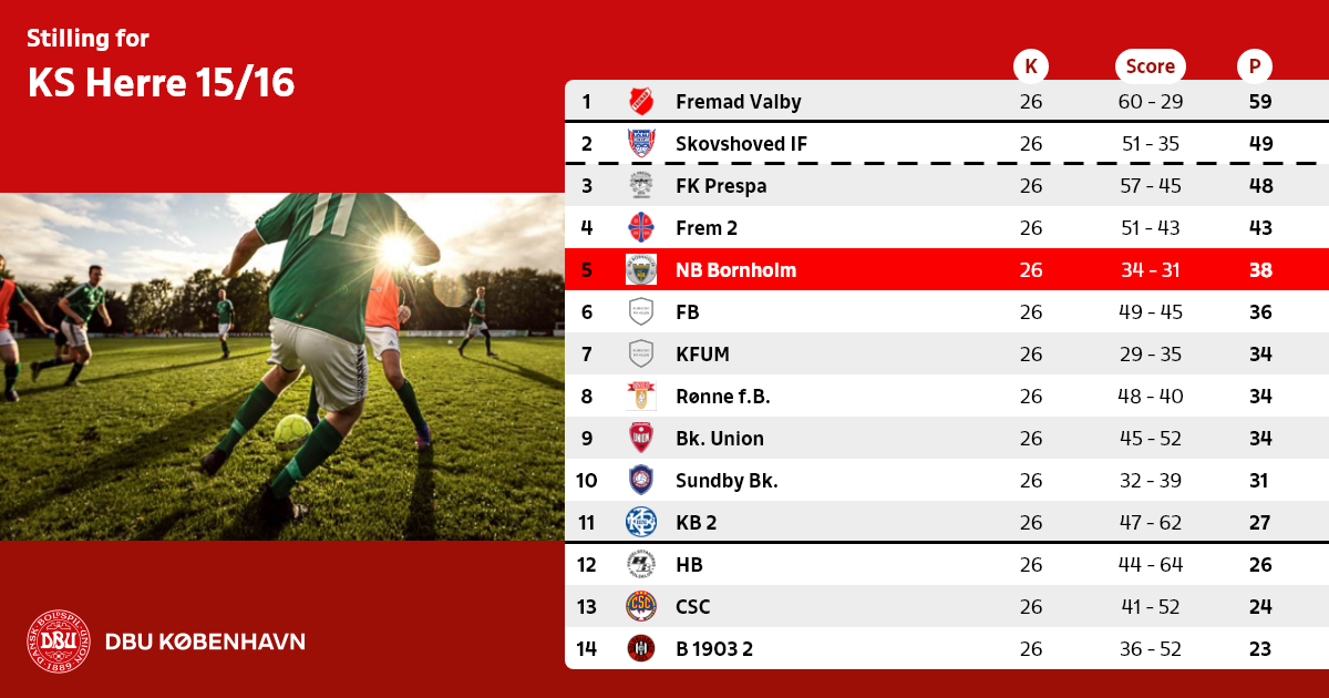 c) Nedrykningen fra Københavnsserien reduceres med ét hold, hvis ingen DBU Bornholm hold placerer sig på nedrykningsplads eller hvis vinderen af DBU Bornholms bedste række ikke kan erstatte et DBU Bornholm-hold, der placerer sig på nedrykningsplads i Københavnsserien.