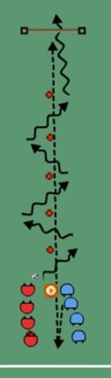 BLÅ fanger sætter øvelsen i gang, skal ned og runde stregen og skal indhente boldholder inden målet.