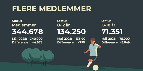 Vi har sat os nogle mål for antallet af medlemmer i fodboldklubberne. Den gode nyhed er, at vi har overgået vores mål; 340.000 medlemmer. Nu gælder det om at holde fast og fortsætte med at give både børn, unge og voksne nogle gode oplevelser, så de fortsætter med at spille fodbold.