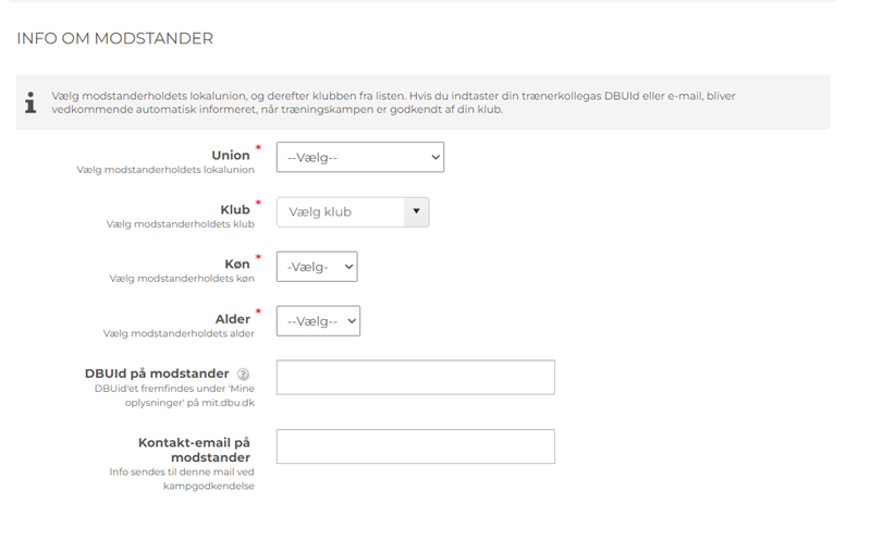 Klubben kan dog vælge at indsnævre feltet, ved kun at tilbyde muligheden til 'Træningskampoprettere'. Alle træningskampe skal godkendes i KlubOffice, før de er endeligt oprettet.