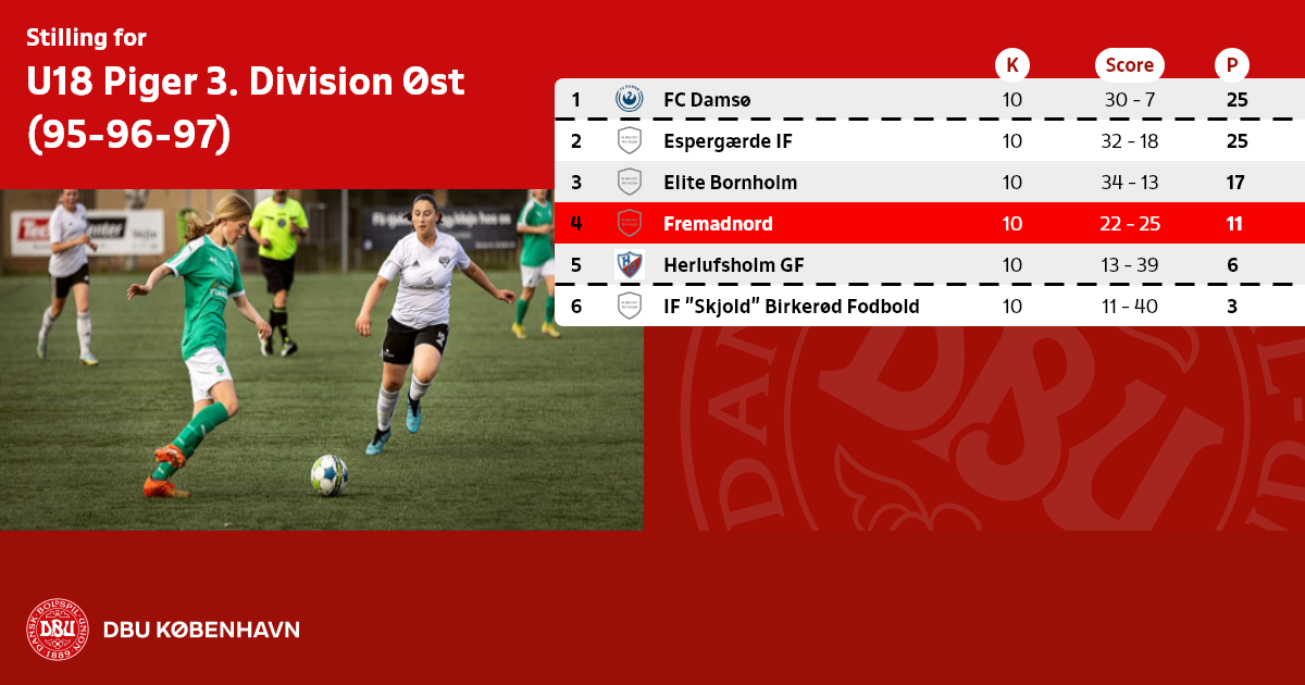 Bemærk at kvalkampen om en plads i forårets U18 Piger 3. Division mellem nr. 6. og nr. 2 i DBU Københavns U18 Pige Mester E er AFLYST.